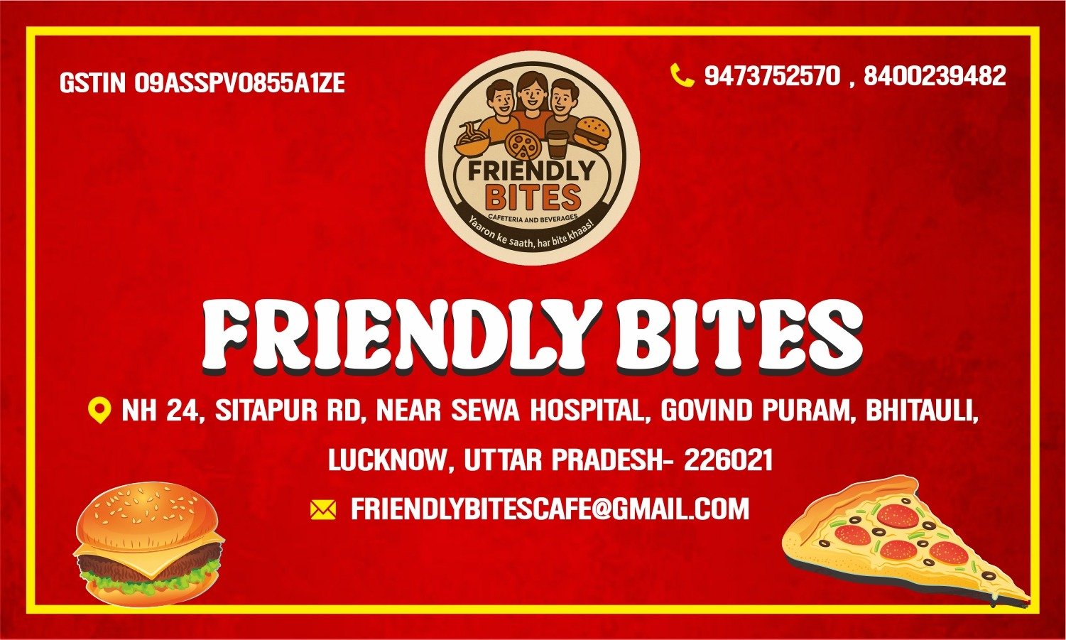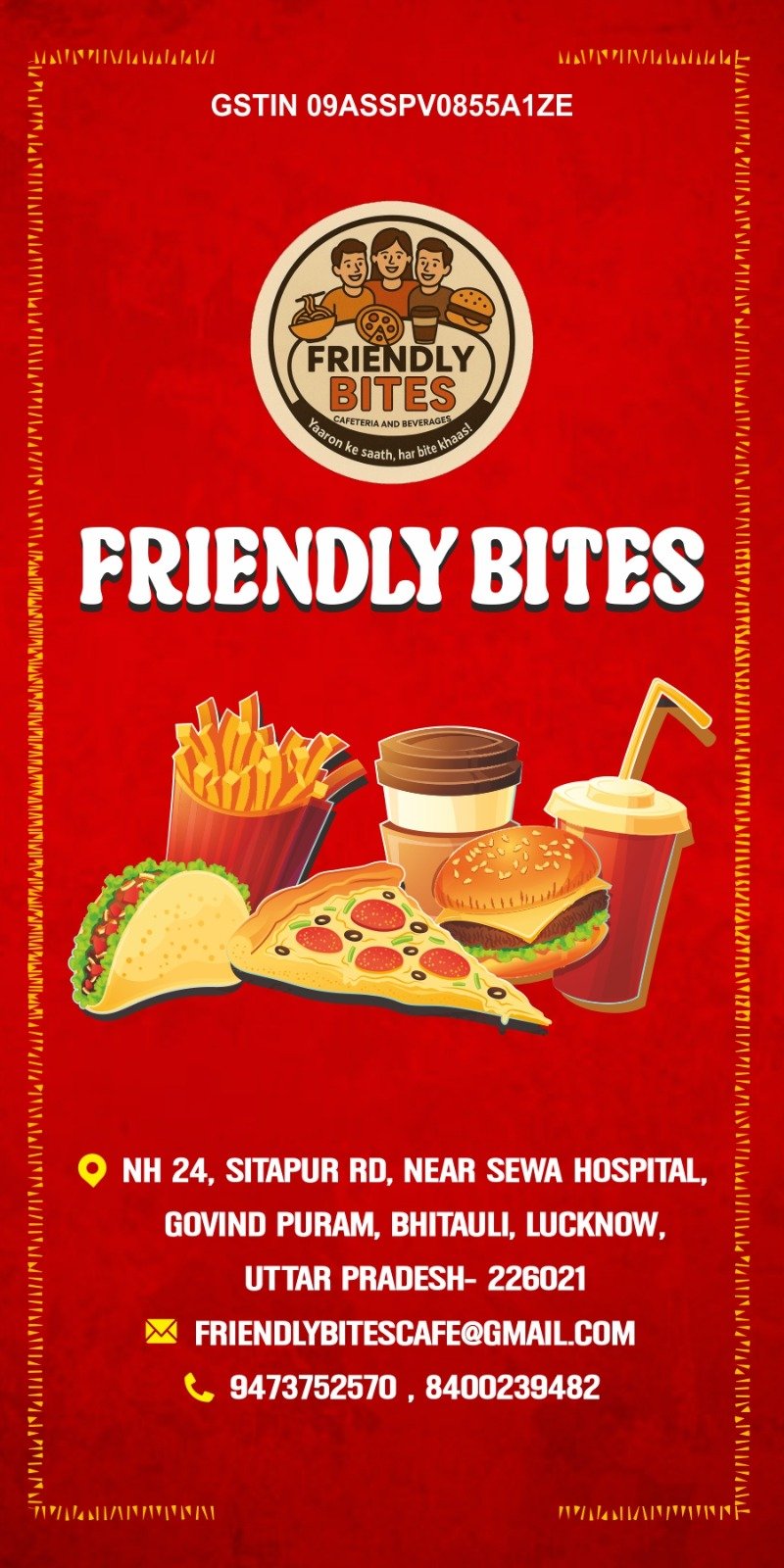 “Friendly Bites is a cozy, welcoming cafeteria that serves fresh, delicious meals and snacks made with care. Whether you’re grabbing a quick coffee, enjoying a hearty lunch, or relaxing with friends over pastries, our friendly atmosphere and quality food make every visit enjoyable. At Friendly Bites, we believe great food brings people together — come taste the difference!”